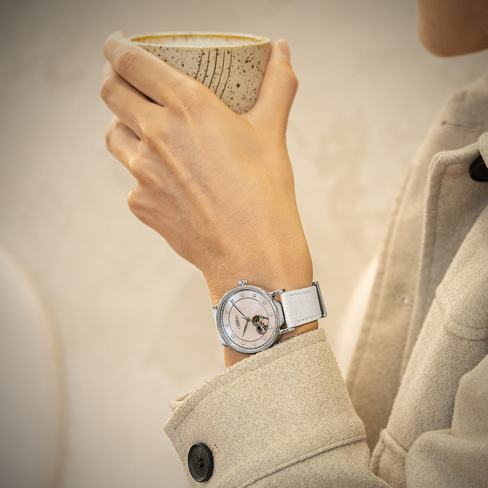 The design is completed by leaf-shaped hands, whose graceful shape and shine reflect feminine softness. The model is delivered with a hand-stitched leather strap or an elegant steel bracelet, always matching the colour of the case – silver, rose gold, or gold.