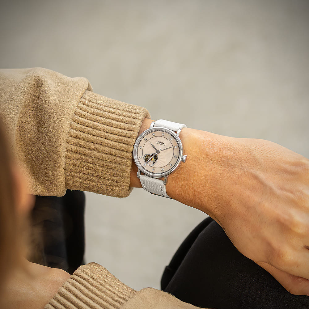 Discover the charm of PRIM Lady Love Elegant – ladies' automatic watch with a double-heart window, combining technical precision with the delicate beauty of Swarovski® crystals. PRIM Lady Love Elegant represents the essence of femininity, softness, and precise watchmaking art. This model was designed for women who want to express their personality through style – with elegance that never goes out of fashion.