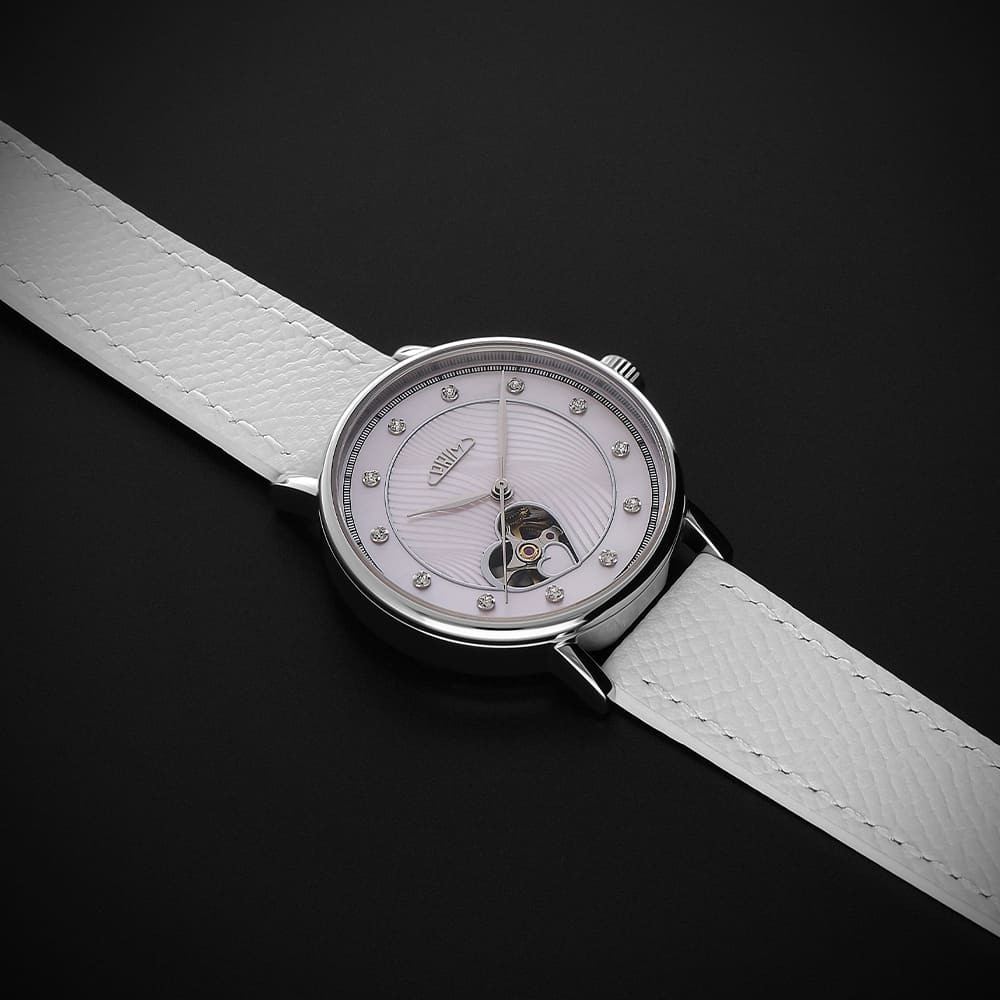 Under the flat sapphire glass with anti-reflective coating, there is an elegant pearl dial with a delicate wavy texture. The shine of the applied indexes set with Swarovski® crystals emphasizes the luxurious look of the watch.