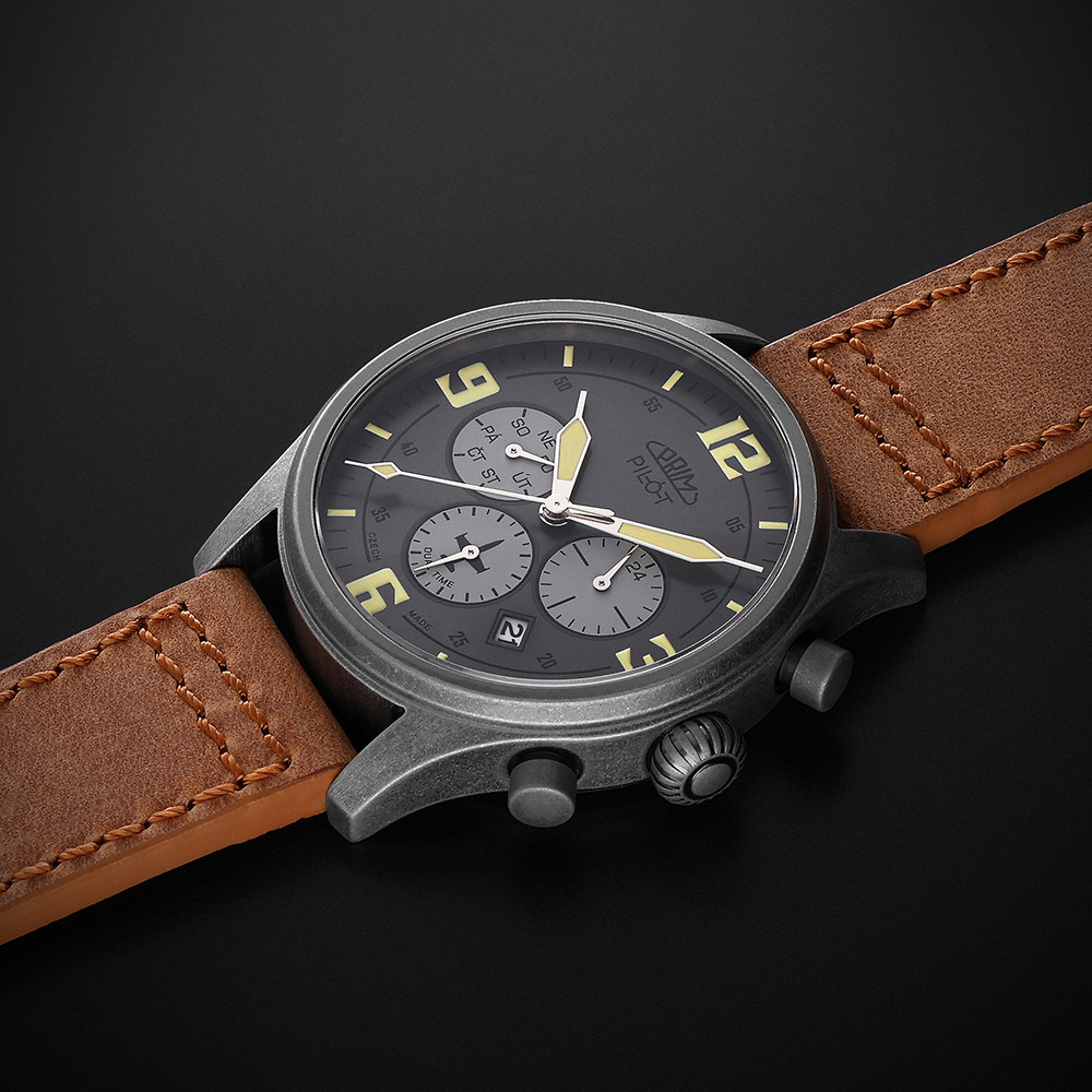 A számlapot a legnagyobb gondossággal tervezték – jellegzetes japán lumineszcens indexekkel rendelkezik, amelyek még rossz körülmények között is tökéletes olvashatóságot biztosítanak. Középen az ikonikus csehszlovák L-39 Albatros kiképző repülőgép sziluettje vonzza a tekintetet, amely mintha lebegne az alszámlapok között. Itt található a hagyományos PILOT felirat is, a repülési műszerekre jellemző keresztirányú dőlésmérő motívumával.