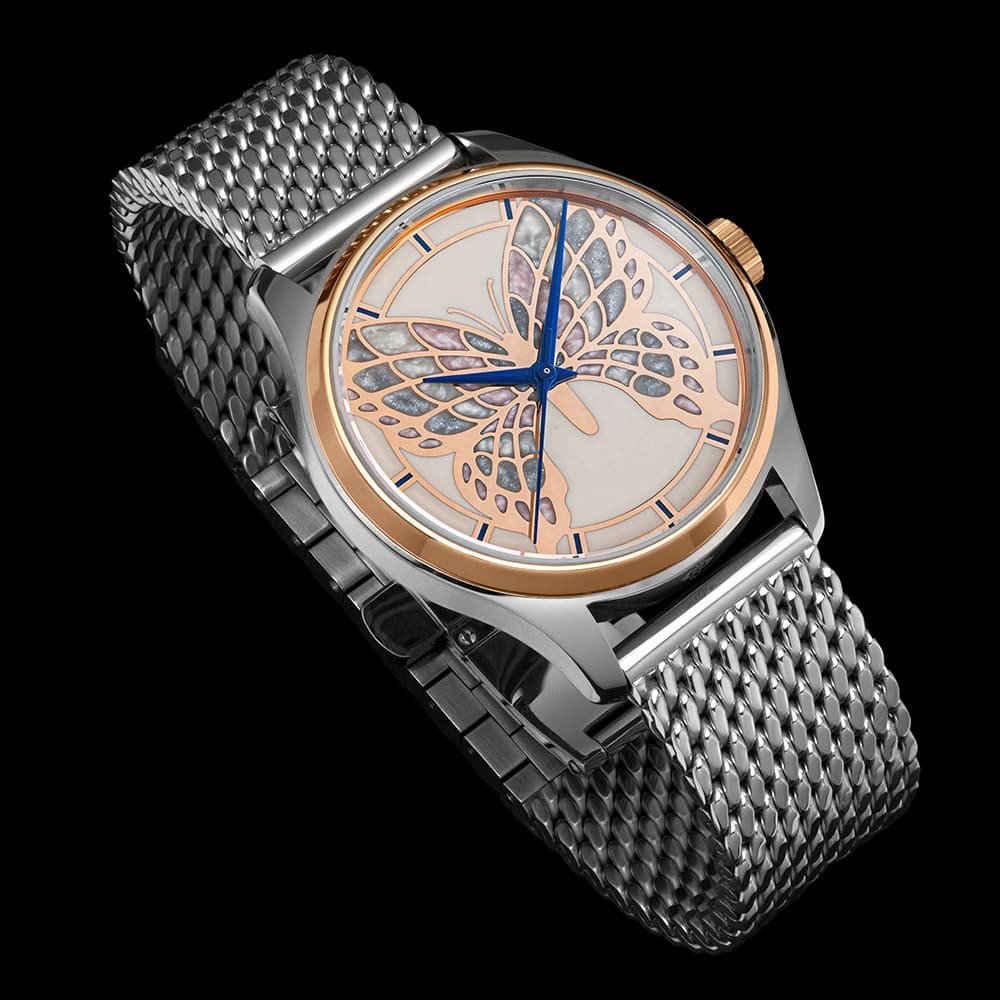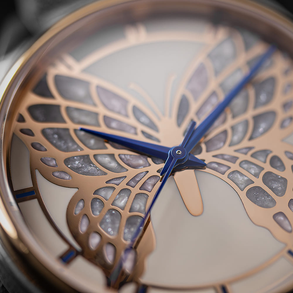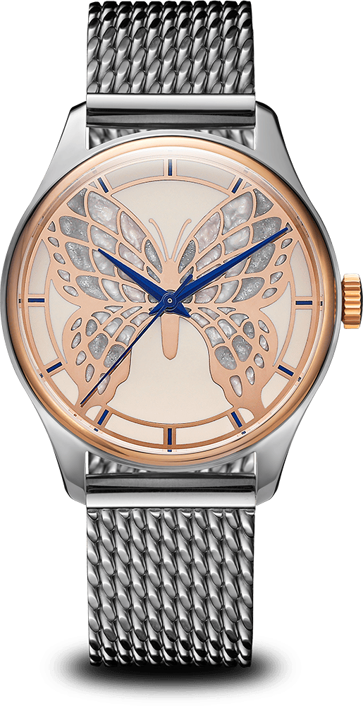 Dámský model PRIM Art v sobě snoubí křehkost motýlích křídel a mistrovské hodinářské umění. Limitovaná edice PRIM ART 2025 zaujme zlaceným číselníkem zdobeným jemnou siluetou motýlích křídel, ručně vytvořenou technologií HyCeram®. Náročný proces, který vyžaduje až 24 hodin soustředěné práce, spočívá v precizním nanášení jednotlivých barevných vrstev. Použití speciálního materiálu vytváří jemné perleťové odlesky, evokující povrch skutečných motýlích křídel. Harmonii barev doplňují modré ručky. Výsledkem je číselník, který se stává malým uměleckým dílem, podtrhující výjimečnost a jedinečnost každého kusu.