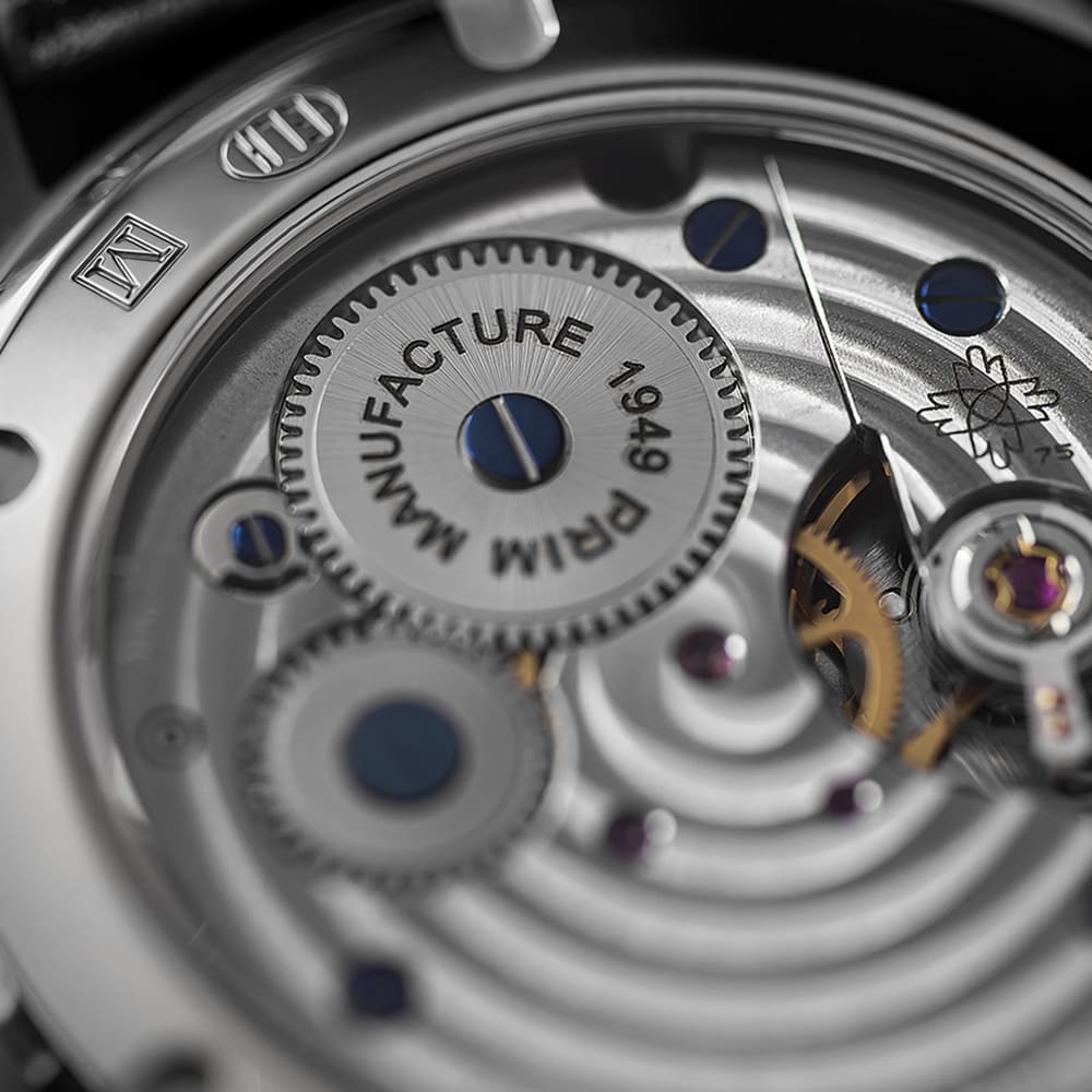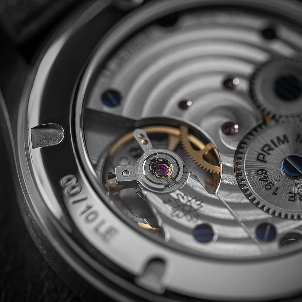 Prosklené zadní víko umožňuje fascinující pohled na inhouse mechanický strojek PRIM s ručním nátahem – ukázku dokonalé hodinářské práce.