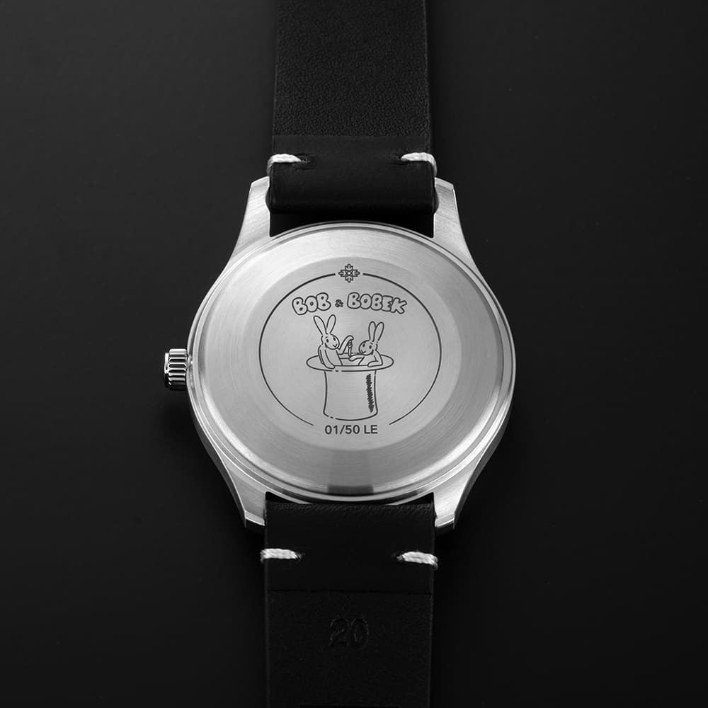 Světlý číselník velmi pěkně kontrastuje s indexy a zajišťuje příjemnou čitelnost, motivy králíků neruší, ale vhodně doplňují celý vzhled. Design zadního víka pokračuje v příběhu o dvou ušatých výtečnících grafikou s oběma králíky, jejich kloboukem a hodinkami.