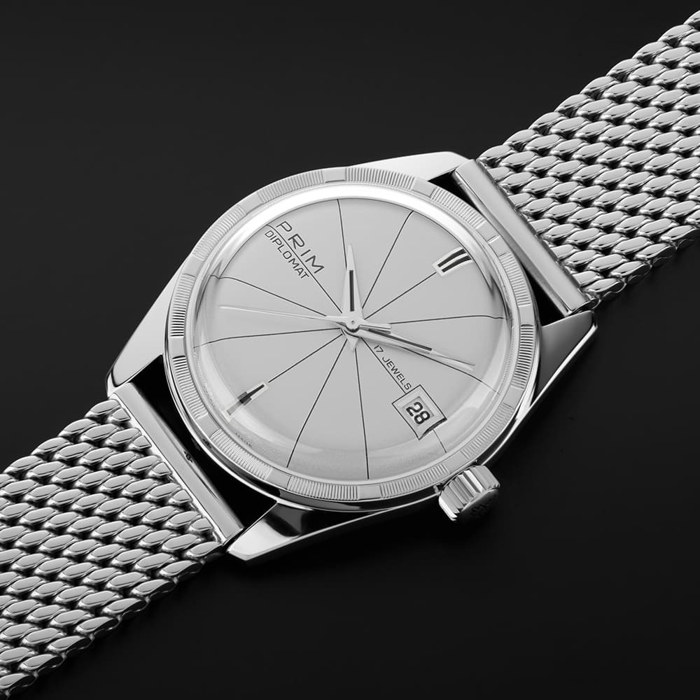 Hodinky PRIM Diplomat jsou dodávány s kovovým tahem, možné je však místo něho zvolit kožený řemínek.