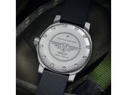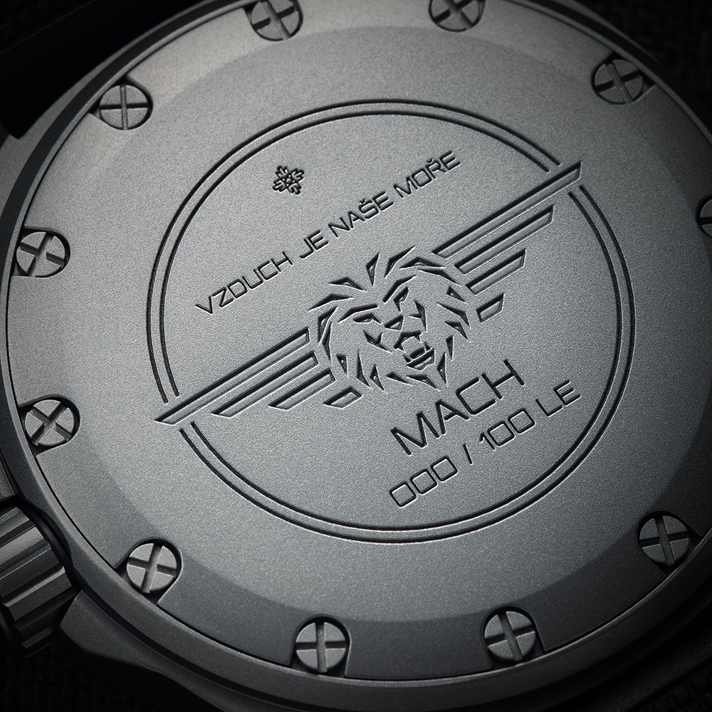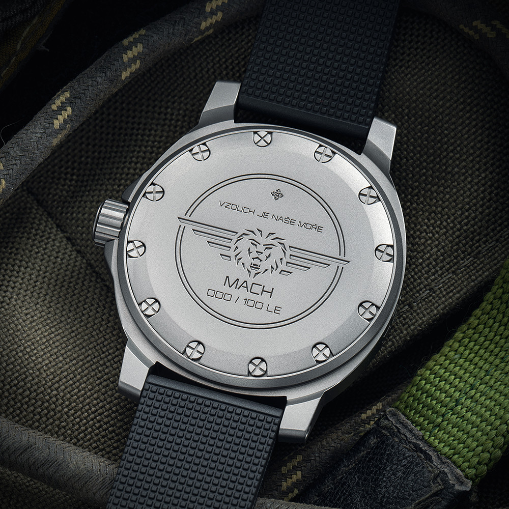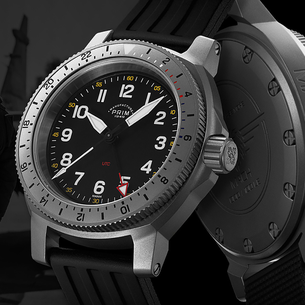 Druhá generace hodinek PRIM Mach inspirovaná letectvím a postavená na odvaze, hrdosti a odhodlání. Titanové pouzdro, zesílená luminiscence, design odkazující na nadzvukové stroje. Robustní, ale lehké. Čitelné a charismatické. Bezproblémový chod hodinek zajišťuje mechanický strojek s frekvencí 21 600 kmitů za hodinu, rezervou chodu 48 hodin a tlumičem nárazů Incabloc. Výjimečný charakter modelu podtrhuje dekorativní brus na strojku s vyobrazením českého lva.