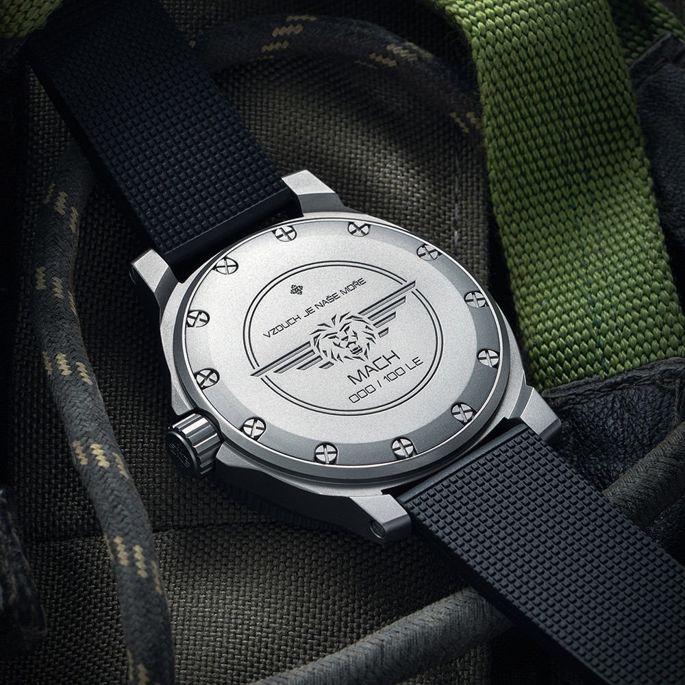 Víčko hodinek nese zobrazení lva a motto: „Vzduch je naše moře“. Model je skvěle doladěn kaučukovým řemínkem.