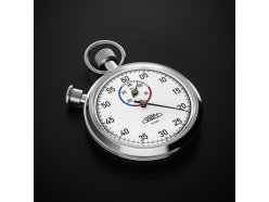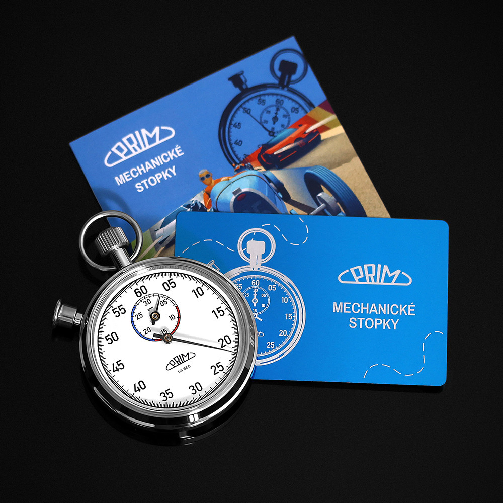PRIM Mechanické stopky - ocelové nerezové pouzdro - bílý/černý číselník
