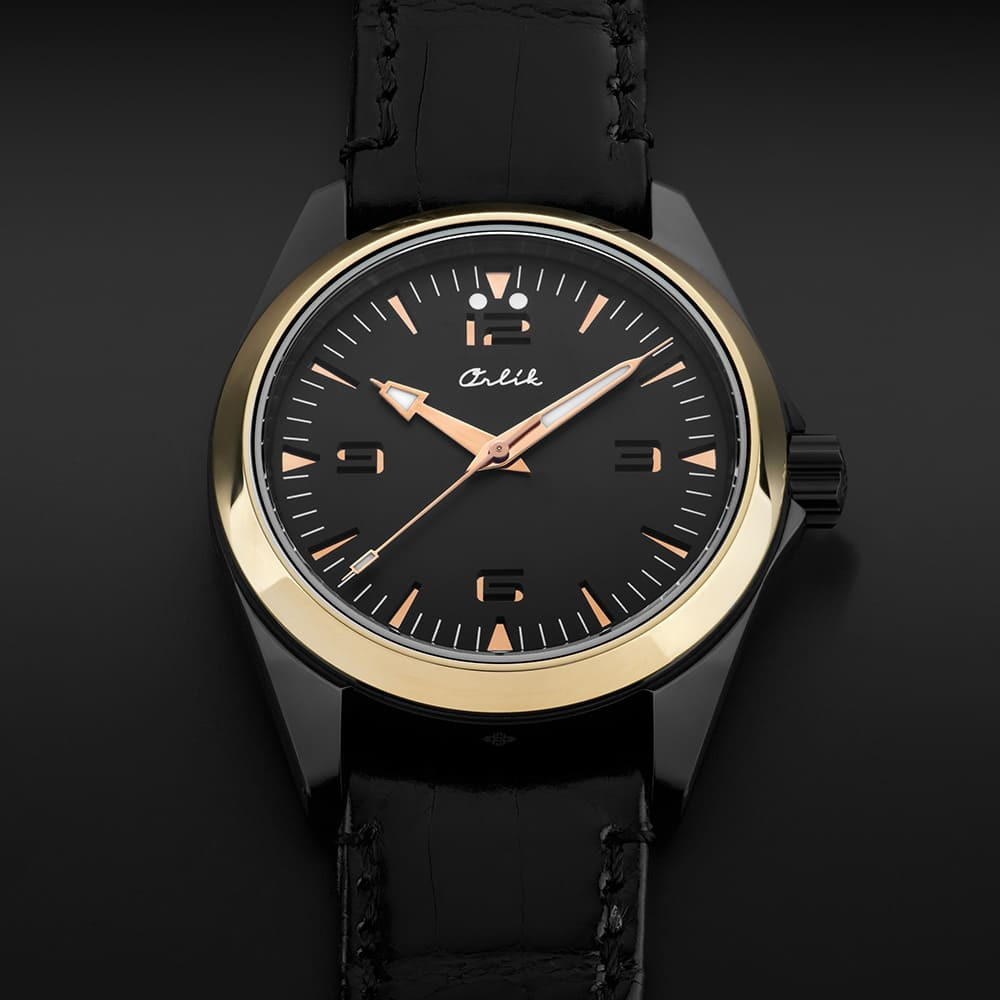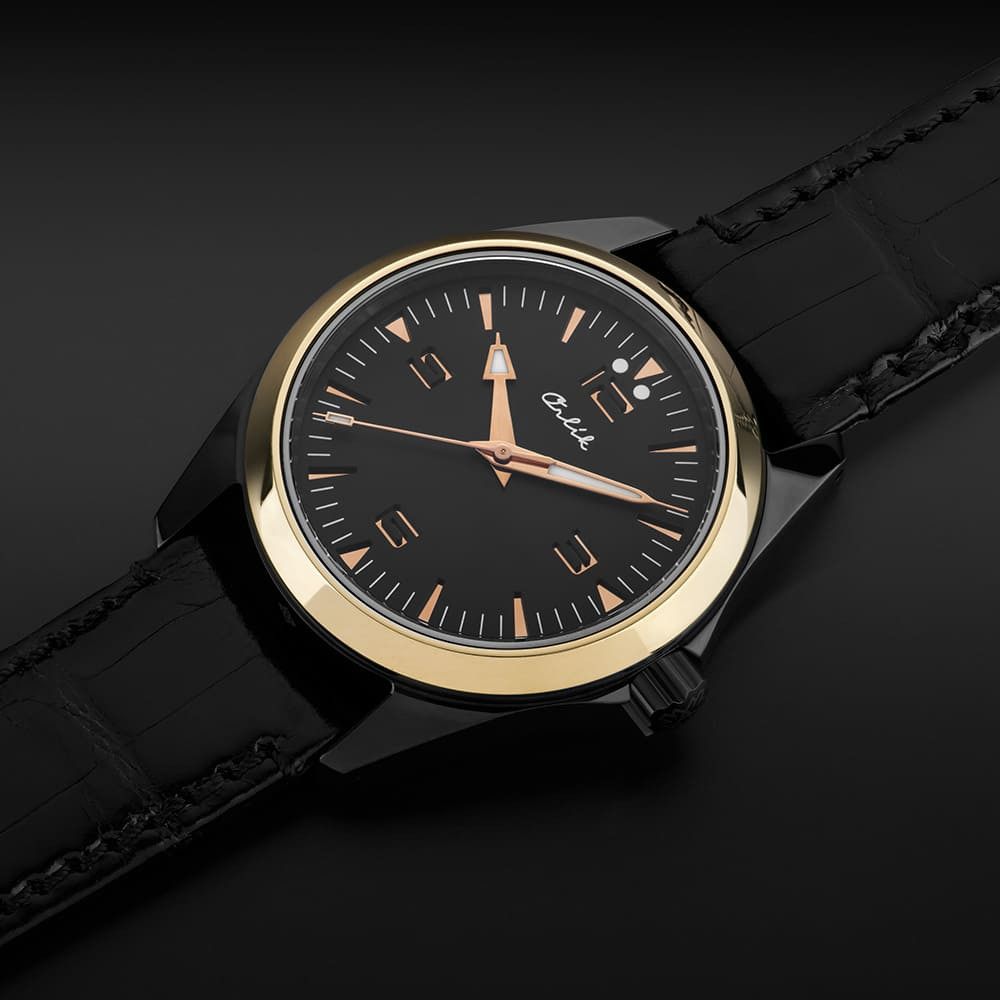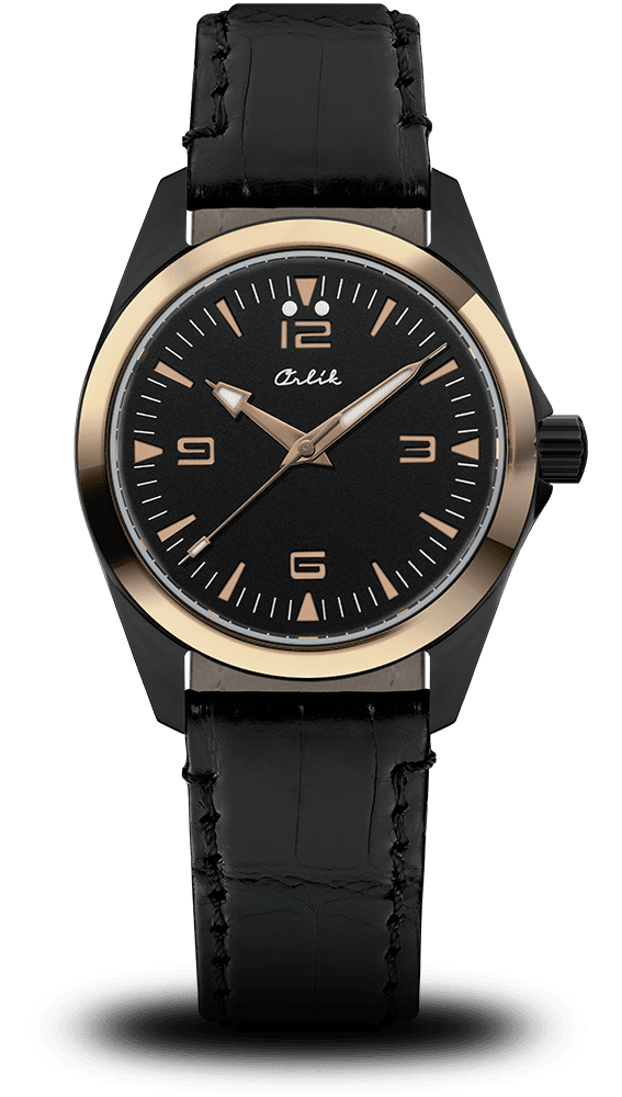 První model ORLÍK, který byl navržen a vyroben přímo pro dámy. Hodinkám vévodí nadčasová kombinace elegantní černé s detaily z růžového zlata. Díky skládanému skeletonovanému číselníku se podařilo docílit působivého kontrastního efektu. Subtilní nápis Orlík, netradičně vyvedený oblým, ručně psaným fontem, dodává číselníku křehkost. Z temně černého pouzdra vystupuje leštěná luneta z růžového zlata. Minimalistický design se hodí pro každou příležitost. Na dámském zápěstí působí neodolatelně, atraktivně a nepřehlédnutelně. V kanceláři i v divadle, na procházce i ve městě.