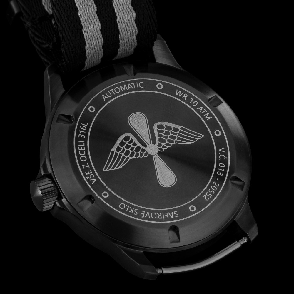 Dominantou plného zadního víka je dvoulistá okřídlená vrtule, odkazující na počátky československého civilního letectví – tento symbol zdobil knoflíky předválečných stejnokrojů zaměstnanců ČSA. Vodotěsnost hodinek byla zvýšena na 10 ATM, díky tomu je model PRIM OK-A vhodný na nošení i v náročnějších podmínkách.