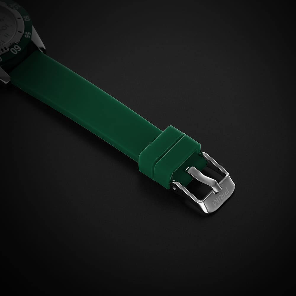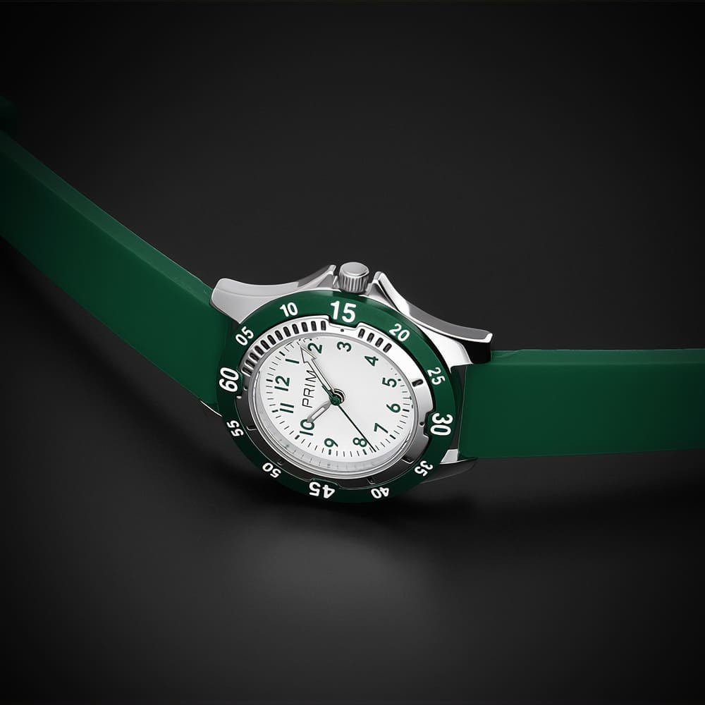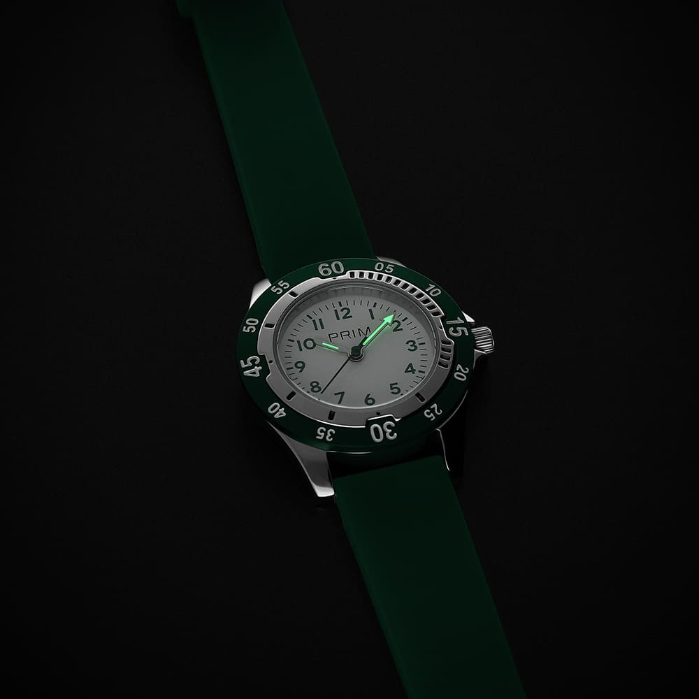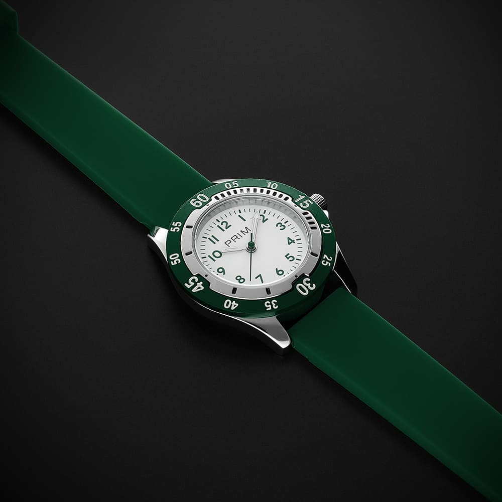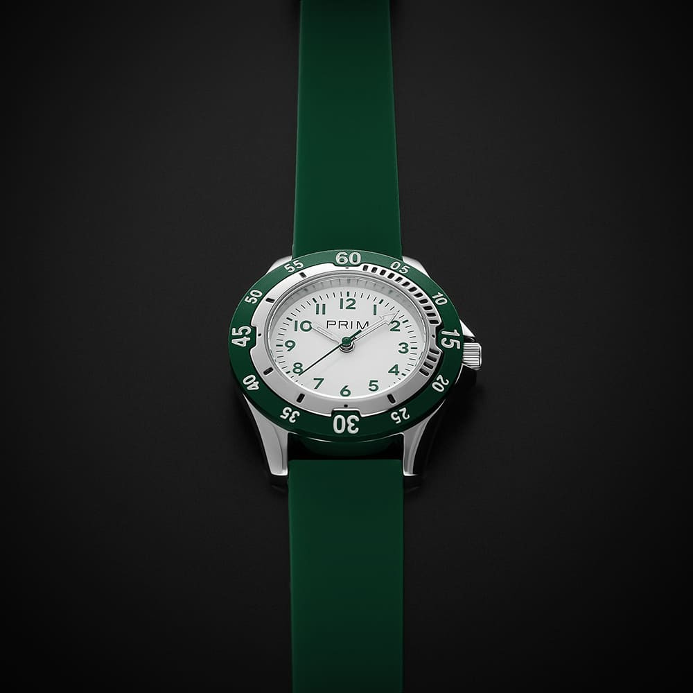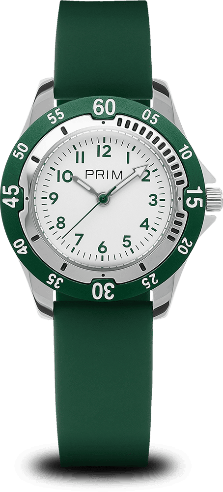 Tým grafiků se nechal inspirovat čitelným a lehce rozpoznatelným ciferníkem s arabskými číslicemi v barvách kroužku a doplnil model barevnými ručičkami. Zvolili jsme také pestré barvy, ze kterých si vybere každý školák a naučí se tak rozpoznávat čas na svých prvních PRIM hodinkách. Praktické je také zobrazení minut na fixním okruží, které pomohou rozpoznat čas. Hodinky jsou kompletně vyrobeny z nerezové oceli 316L a s voděodolností 10 ATM. Celkový vzhled doplňuje barevný příjemný silikonový řemínek.