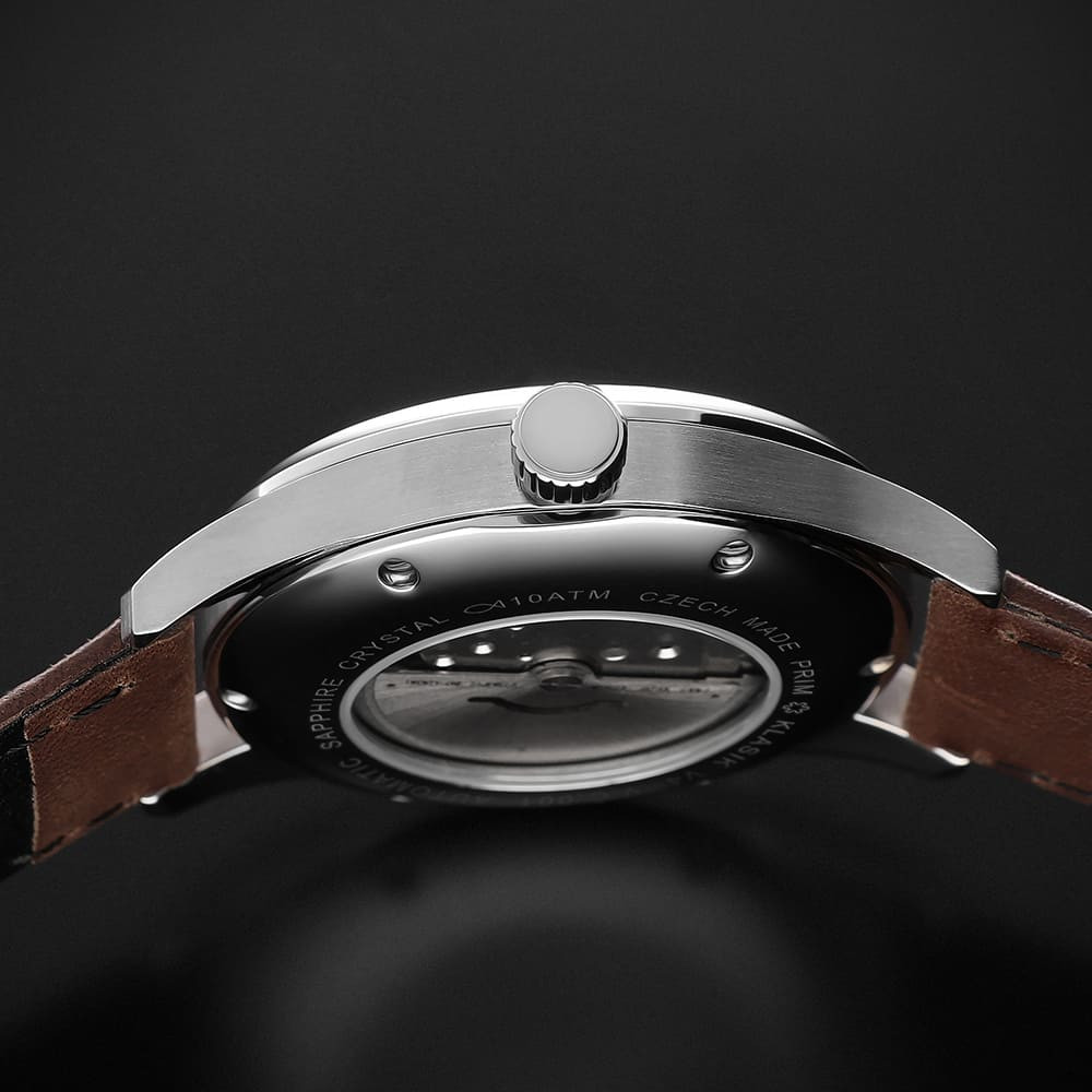 Púzdro je vyrobené z ušľachtilej nerezovej ocele 316L v kombinácii matu a lesku. Zvolené púzdro tohto elegantného modelu podčiarkuje celkový spoločenský vzhľad. Nie je možné si nevšimnúť uchytenie nožičiek so skoseným (lomeným) uhlom, ktoré dokonale odráža svetlo a vyzdvihuje tak obrysy púzdra. Hodinky poháňa automatický strojček Miyota 8215 s 21 600 kmitmi, ktorý sa uvádza do chodu pohybom vašej ruky.